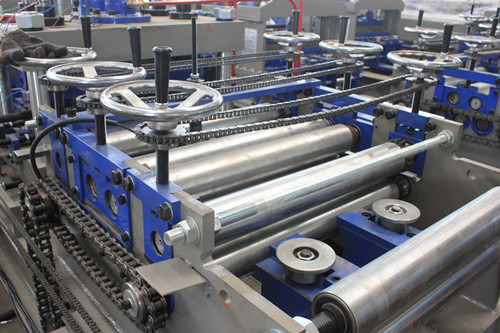 Al onze gordingmachines zijn voorzien van een materiaaltoevoergeleider met twee rollen (één opwaartse en één neerwaartse rol) en een nivelleerinrichting met 5 rollen (twee opwaartse en drie neerwaartse rollen) voor het rechtzetten.